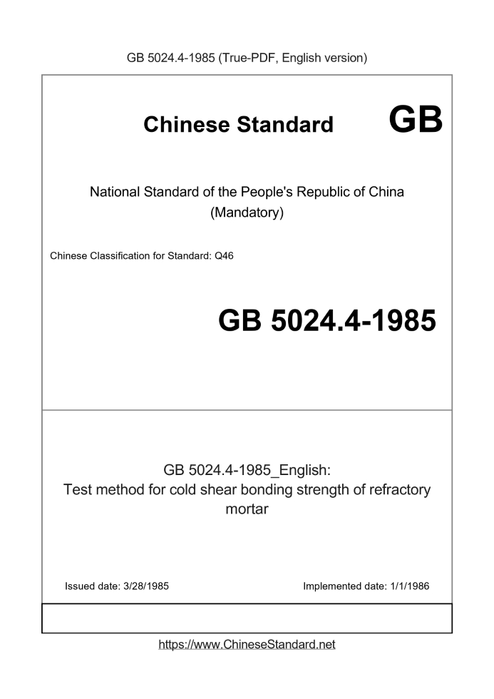 Delivery: <= 2 days. True-PDF full-copy in English will be manually translated and delivered via email. GB 5024.4-1985: Test method for cold shear bonding strength of refractory mortar Status: Obsolete