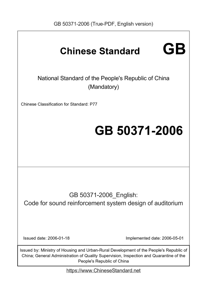 Delivery: <= 4 days. True-PDF full-copy in English will be manually translated and delivered via email. GB 50371-2006: Code for sound reinforcement system design of auditorium Status: Valid