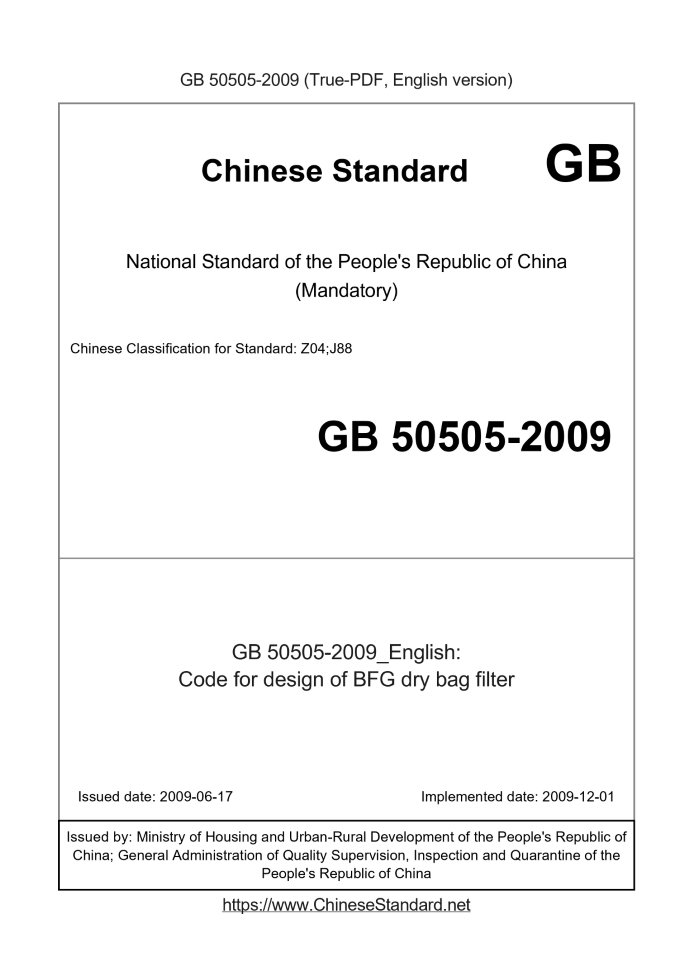 Delivery: <= 8 days. True-PDF full-copy in English will be manually translated and delivered via email. GB 50505-2009: Code for design of BFG dry bag filter Status: Valid
