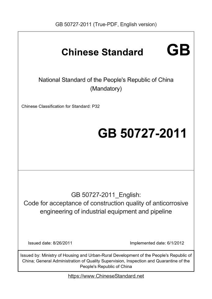 Basic dataStandard ID: GB 50727-2011 (GB50727-2011)Description (Translated English): Code for acceptance of construction quality of anticorrosive engineering of industrial equipment and pipeline Sector / Industry: National Standard Classification of Chinese Standard: P32 Classification of International Standard: 91.060.01 Word Count Estimation: 94,997 Date of Issue: 8/26/2011 Date of Implementation: 6/1/2012 Quoted Standard: GB 50235; GB 50252; GB 50726; GB/T 531.1; GB/T 1470; GB/T 2577; GB/T 2941; GB/T 2997; GB/T 3001; GB/T 3854; GB/T 4956; GB/T 5072; GB/T 8488; GB/T 8642; GB/T 8923.1; GB/T 9793; GB/T 12608; GB/T 18241.1; HG/T 3831; JC/T 424; JC 514.1 Regulation (derived from): Ministry of Housing and Urban-Rural Development Bulletin No.1143 Issuing agency(ies): Ministry of Housing and Urban-Rural Development of the People's Republic of China; General Administration of Quality Supervision, Inspection and Quarantine of the People's Republic of China Summary: This standard applies to new construction, renovation and expansion of steel, cast iron industrial equipment and pipeline anticorrosion construction quality acceptance. Tips & Frequently Asked Questions:Question 1: How long will the true-PDF of GB 50727-2011_English be delivered?Answer: Upon your order, we will start to translate GB 50727-2011_English as soon as possible, and keep you informed of the progress. The lead time is typically 9 ~ 13 working days. The lengthier the document the longer the lead time.Question 2: Can I share the purchased PDF of GB 50727-2011_English with my colleagues?Answer: Yes. The purchased PDF of GB 50727-2011_English will be deemed to be sold to your employer/organization who actually pays for it, including your colleagues and your employer's intranet.Question 3: Does the price include tax/VAT?Answer: Yes. Our tax invoice, downloaded/delivered in 9 seconds, includes all tax/VAT and complies with 100+ countries' tax regulations (tax exempted in 100+ countries) -- See Avoidance of Double Taxation Agreements (DTAs): List of DTAs signed between Singapore and 100+ countriesQuestion 4: Do you accept my currency other than USD?Answer: Yes. If you need your currency to be printed on the invoice, please write an email to Sales@ChineseStandard.net. In 2 working-hours, we will create a special link for you to pay in any currencies. Otherwise, follow the normal steps: Add to Cart -- Checkout -- Select your currency to pay. |