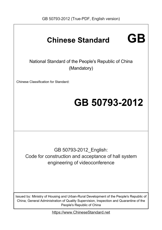 Delivery: <= 13 days. True-PDF full-copy in English will be manually translated and delivered via email. GB 50793-2012: Code for construction and acceptance of hall system engineering of videoconference Status: Valid