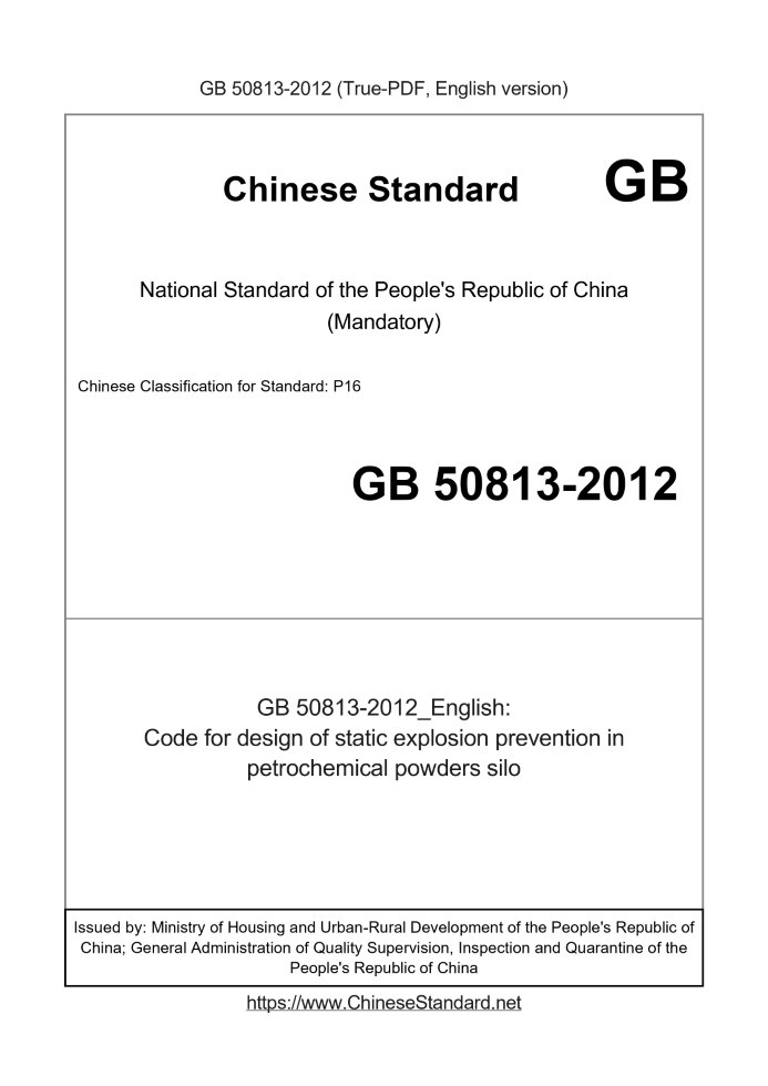 Delivery: <= 7 days. True-PDF full-copy in English will be manually translated and delivered via email. GB 50813-2012: Code for design of static explosion prevention in petrochemical powders silo Status: Valid