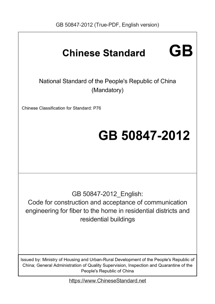 Delivery: <= 6 days. True-PDF full-copy in English will be manually translated and delivered via email. GB 50847-2012: Code for construction and acceptance of communication engineering for fiber to the home in residential districts and residential buildings Status: Valid