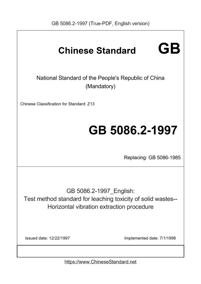 Standard ID: GB 5086.2-1997 (GB5086.2-1997)Description (Translated English): Test method standard for leaching toxicity of solid wastes--Horizontal vibration extraction procedure