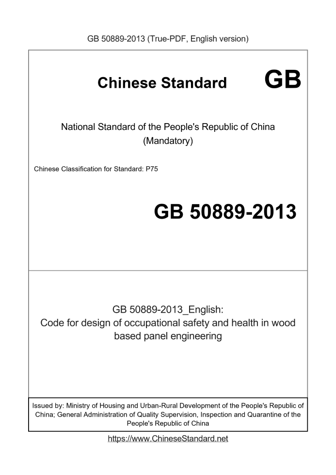 Delivery: <= 8 days. True-PDF full-copy in English will be manually translated and delivered via email. GB 50889-2013: Code for design of occupational safety and health in wood based panel engineering Status: Valid