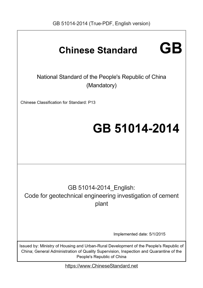 Delivery: <= 10 days. True-PDF full-copy in English will be manually translated and delivered via email. GB 51014-2014: Code for geotechnical engineering investigation of cement plant Status: Valid