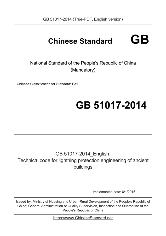 GB 51017-2014: Technical code for lightning protection engineering of ancient buildings