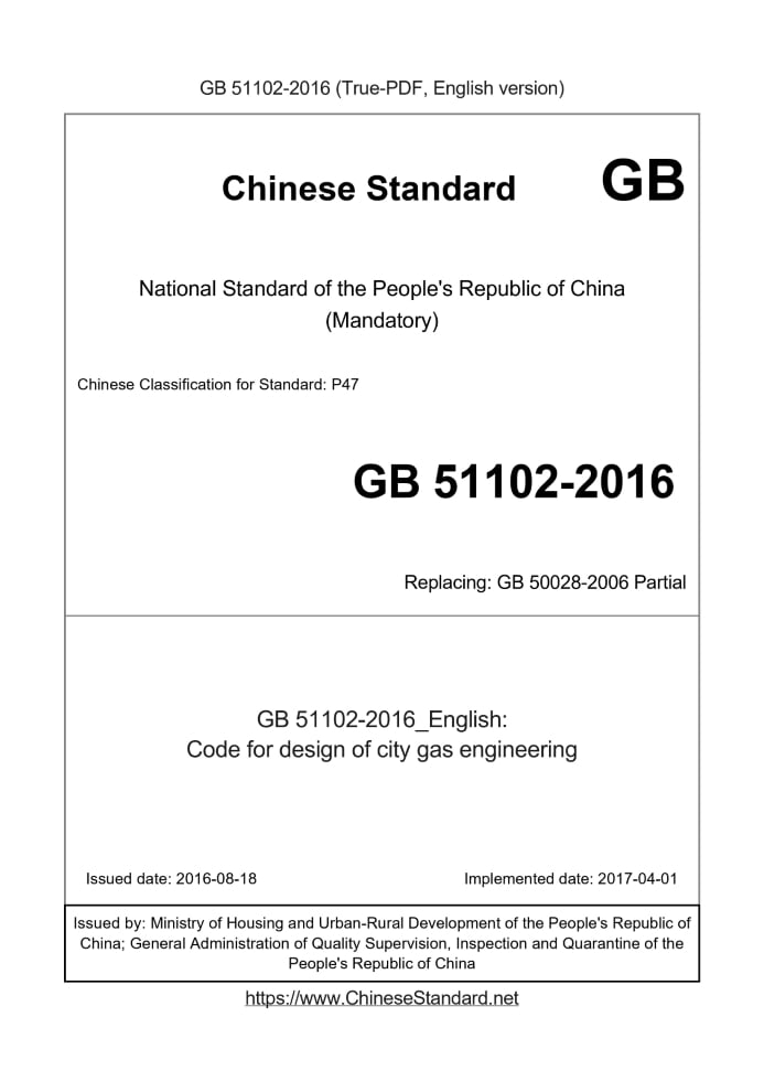 Delivery: <= 10 days. True-PDF full-copy in English will be manually translated and delivered via email. GB 51102-2016: Code for design of city gas engineering Status: Valid