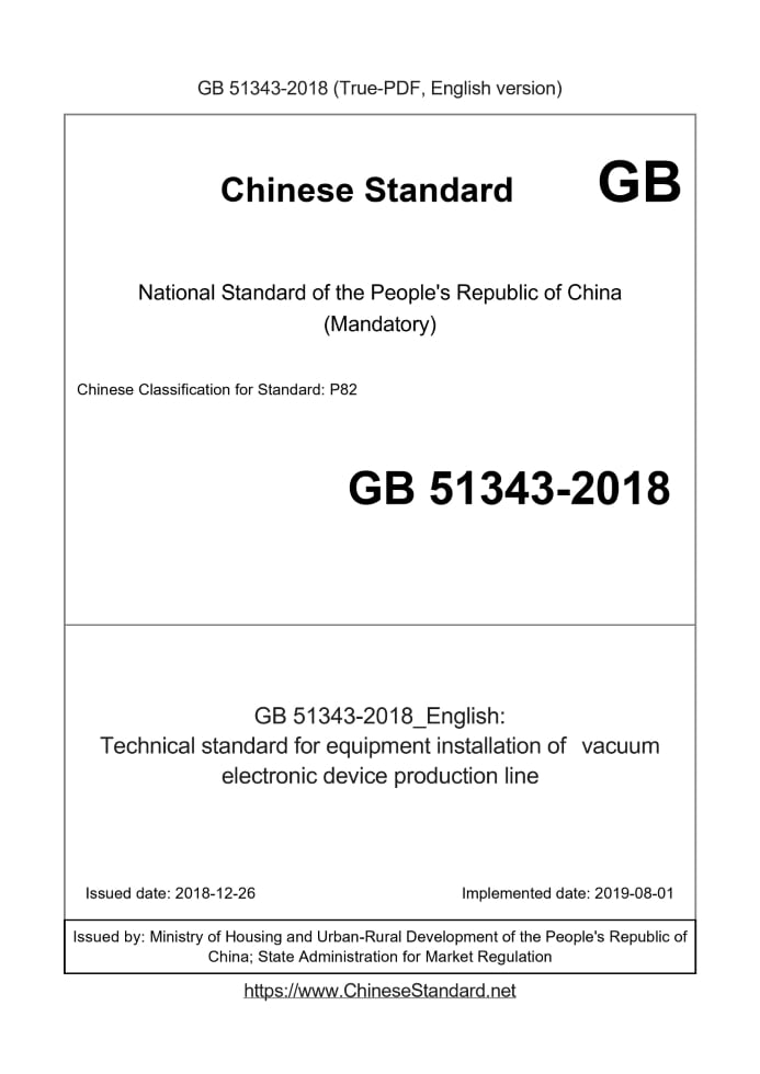Delivery: <= 8 days. True-PDF full-copy in English will be manually translated and delivered via email. GB 51343-2018: Technical standard for equipment installation of vacuum electronic device production line Status: Valid