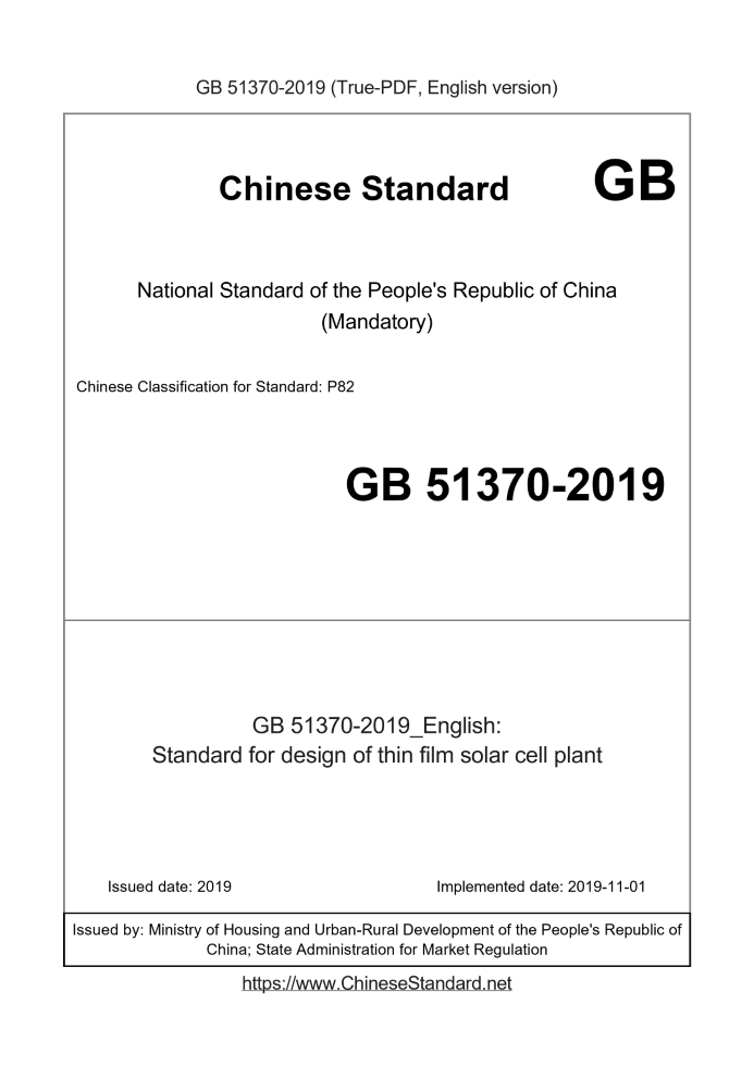 Delivery: <= 10 days. True-PDF full-copy in English will be manually translated and delivered via email. GB 51370-2019: Standard for design of thin film solar cell plant Status: Valid