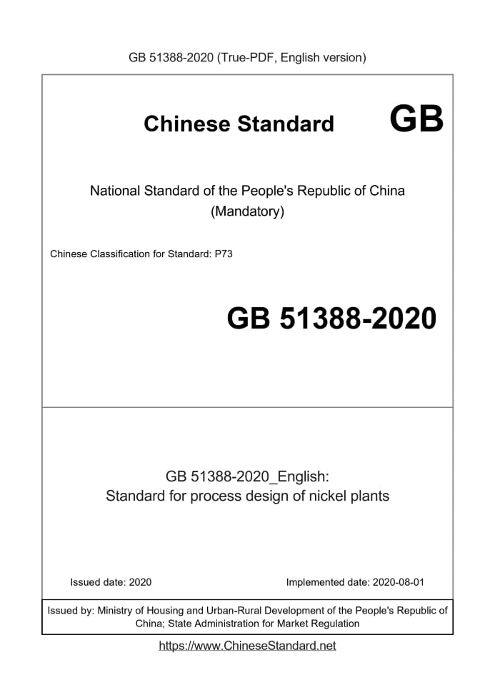 Delivery: <= 11 days. True-PDF full-copy in English will be manually translated and delivered via email. GB 51388-2020: Standard for process design of nickel plants Status: Valid
