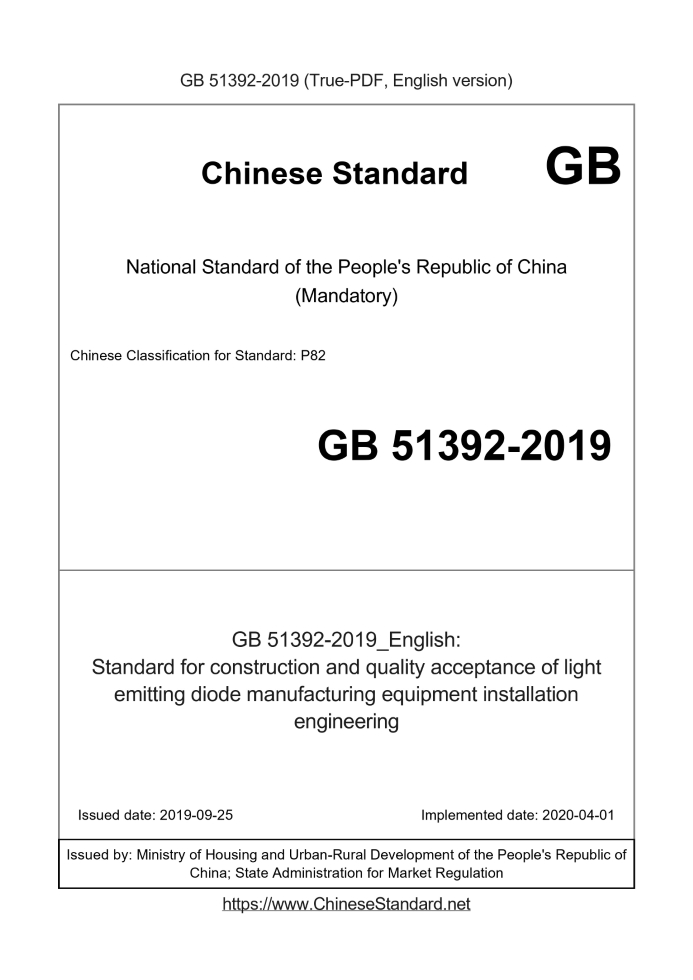 Delivery: <= 9 days. True-PDF full-copy in English will be manually translated and delivered via email. GB 51392-2019: Standard for construction and quality acceptance of light emitting diode manufacturing equipment installation engineering Status: Valid