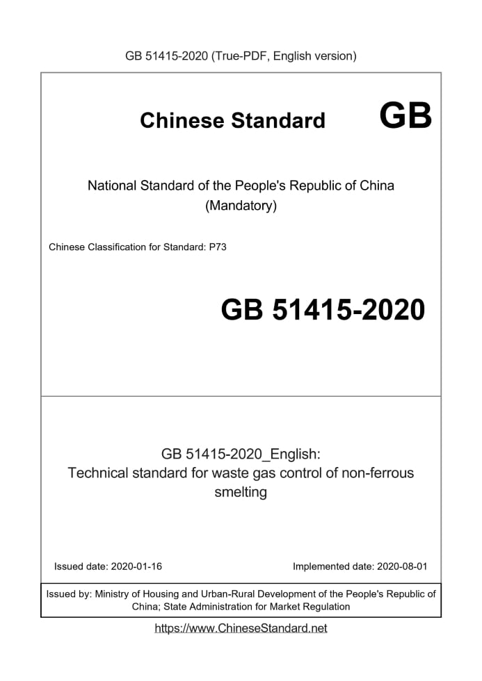 Delivery: <= 8 days. True-PDF full-copy in English will be manually translated and delivered via email. GB 51415-2020: Technical standard for waste gas control of non-ferrous smelting Status: Valid