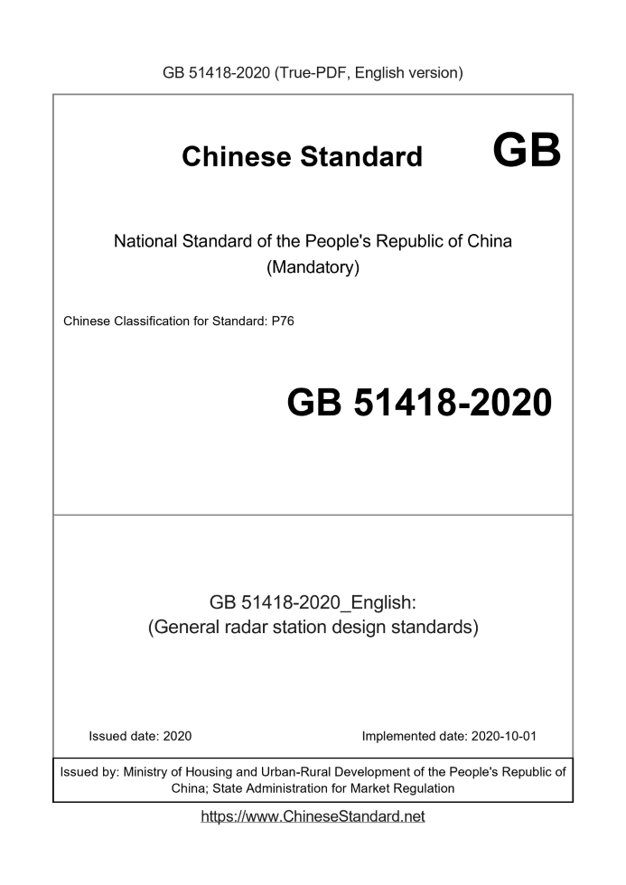 Delivery: <= 7 days. True-PDF full-copy in English will be manually translated and delivered via email. GB 51418-2020: (General radar station design standards) Status: Valid