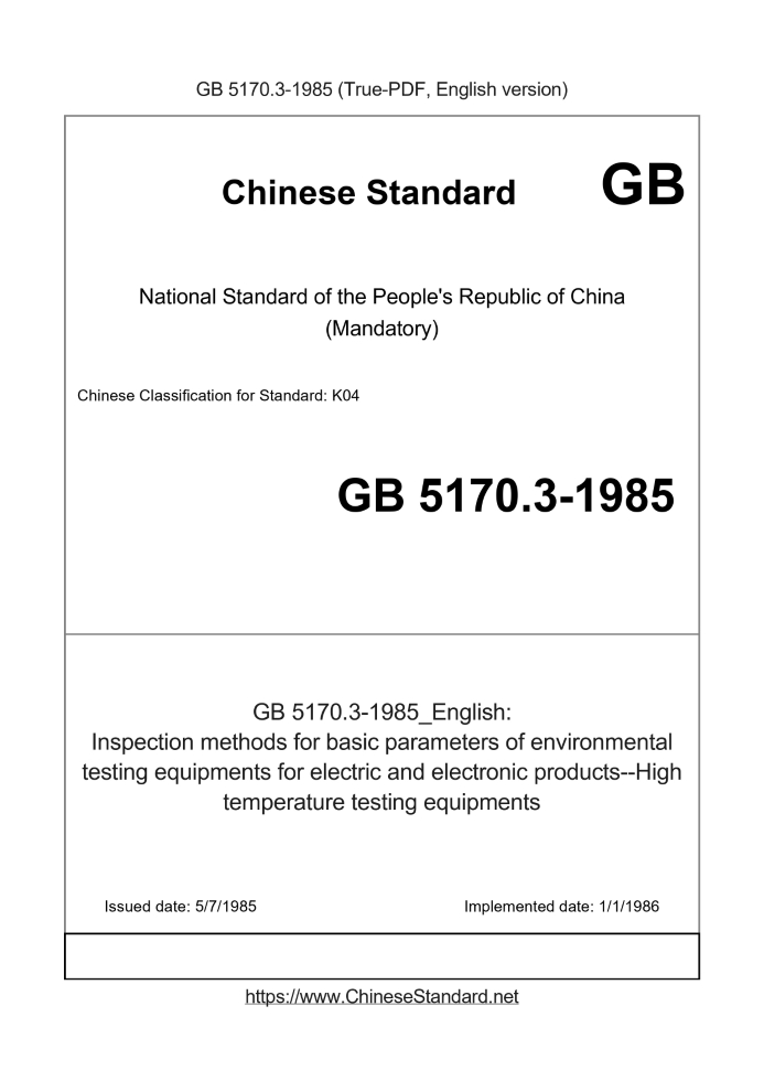 Delivery: <= 3 days. True-PDF full-copy in English will be manually translated and delivered via email. GB 5170.3-1985: Inspection methods for basic parameters of environmental testing equipments for electric and electronic products--High temperature testing equipments Status: Obsolete