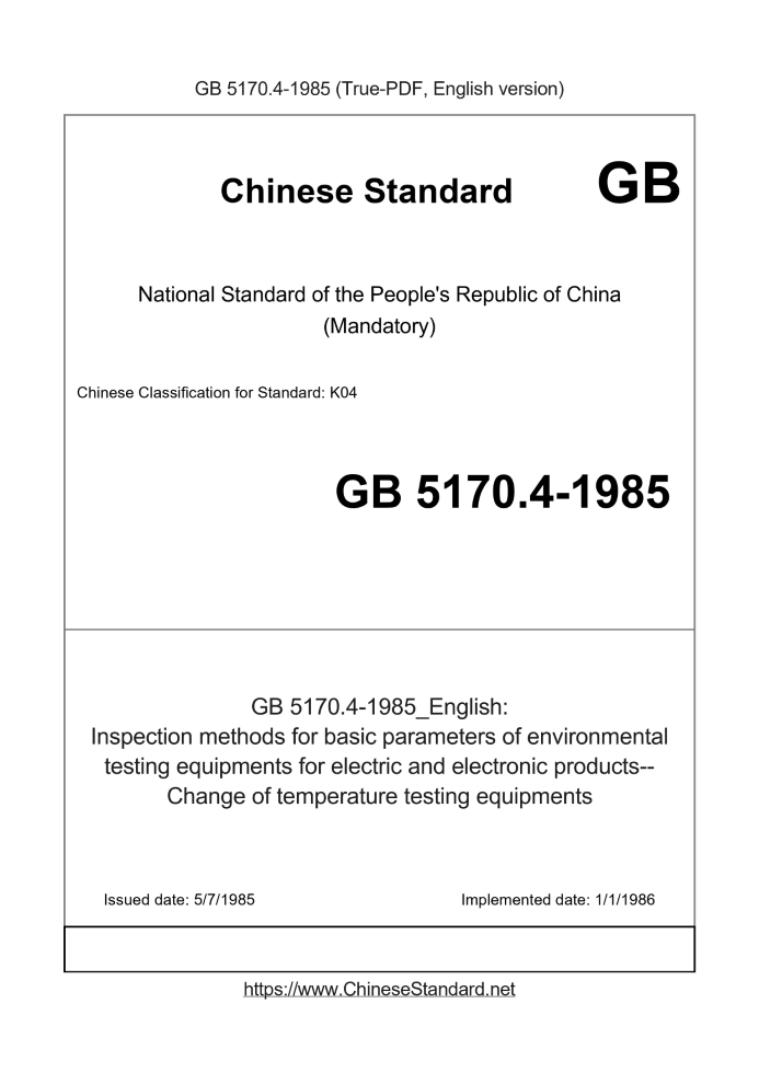Delivery: <= 3 days. True-PDF full-copy in English will be manually translated and delivered via email. GB 5170.4-1985: Inspection methods for basic parameters of environmental testing equipments for electric and electronic products--Change of temperature testing equipments Status: Obsolete