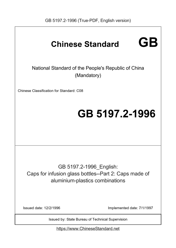 Delivery: <= 3 days. True-PDF full-copy in English will be manually translated and delivered via email. GB 5197.2-1996: Caps for infusion glass bottles--Part 2: Caps made of aluminium-plastics combinations Status: Obsolete