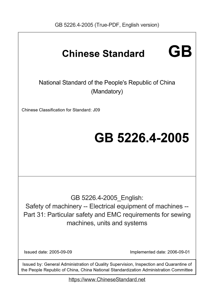 Delivery: <= 3 days. True-PDF full-copy in English will be manually translated and delivered via email. GB 5226.4-2005: Safety of machinery -- Electrical equipment of machines -- Part 31: Particular safety and EMC requirements for sewing machines, units and systems Status: Obsolete