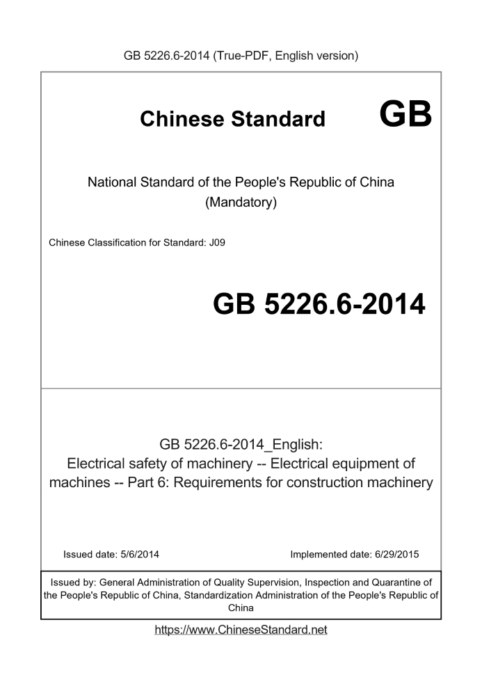 Delivery: <= 6 days. True-PDF full-copy in English will be manually translated and delivered via email. GB 5226.6-2014: Electrical safety of machinery -- Electrical equipment of machines -- Part 6: Requirements for construction machinery Status: Valid