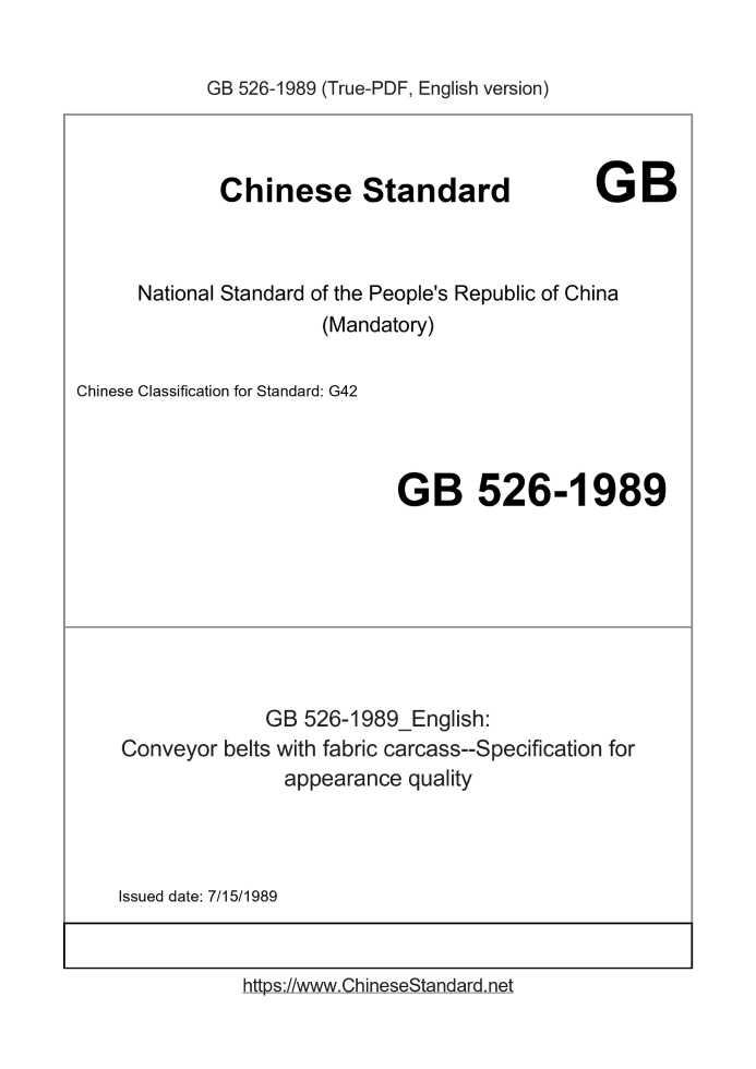 Delivery: <= 2 days. True-PDF full-copy in English will be manually translated and delivered via email. GB 526-1989: Conveyor belts with fabric carcass--Specification for appearance quality Status: Obsolete