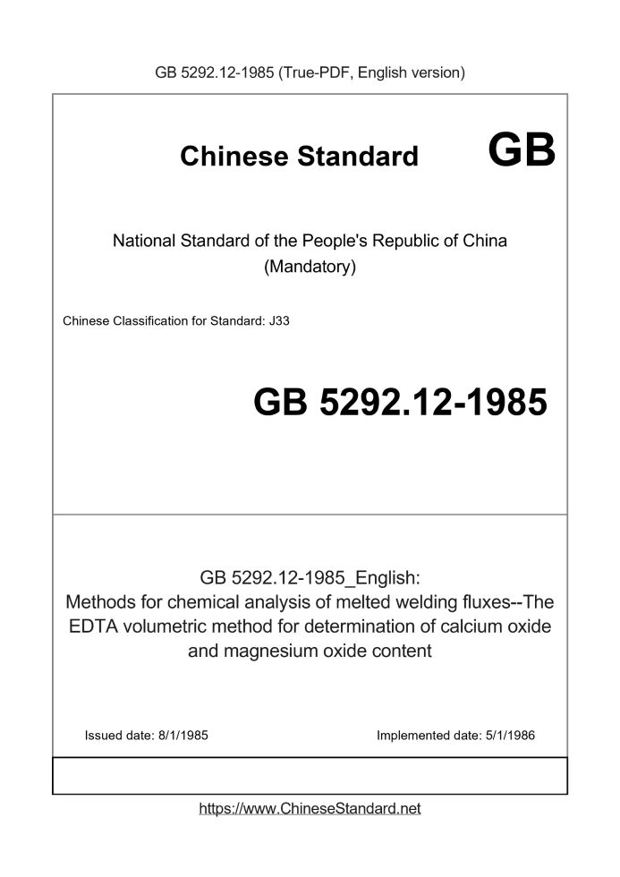 Delivery: <= 2 days. True-PDF full-copy in English will be manually translated and delivered via email. GB 5292.12-1985: Methods for chemical analysis of melted welding fluxes--The EDTA volumetric method for determination of calcium oxide and magnesium oxide content Status: Obsolete
