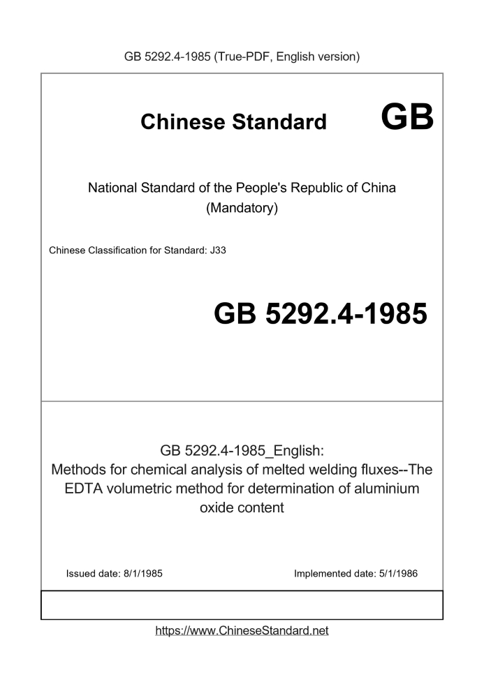 Delivery: <= 2 days. True-PDF full-copy in English will be manually translated and delivered via email. GB 5292.4-1985: Methods for chemical analysis of melted welding fluxes--The EDTA volumetric method for determination of aluminium oxide content Status: Obsolete