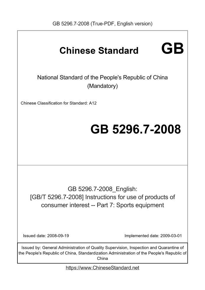 Delivery: <= 3 days. True-PDF full-copy in English will be manually translated and delivered via email. GB 5296.7-2008: [GB/T 5296.7-2008] Instructions for use of products of consumer interest -- Part 7: Sports equipment Status: Valid