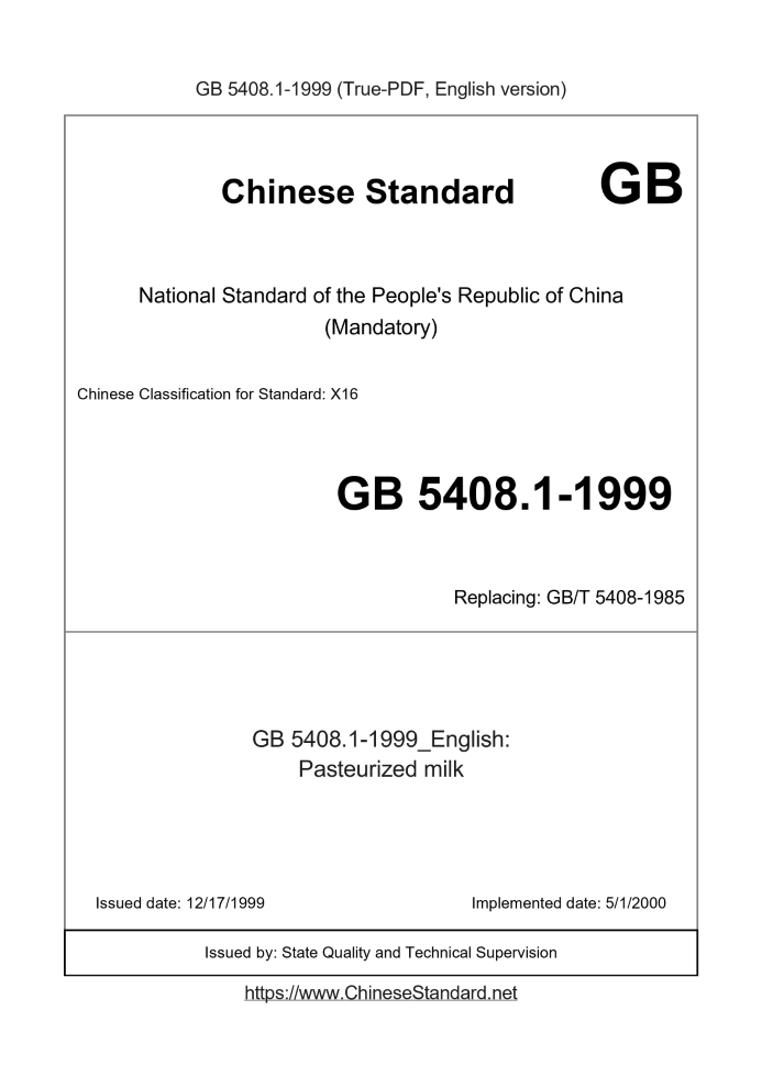 Delivery: <= 2 days. True-PDF full-copy in English will be manually translated and delivered via email. GB 5408.1-1999: Pasteurized milk Status: Obsolete GB 5408.1: Historical versions