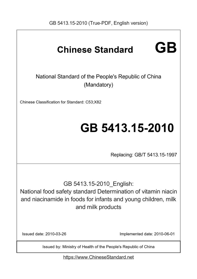 Delivery: <= 3 days. True-PDF full-copy in English will be manually translated and delivered via email. GB 5413.15-2010: National food safety standard Determination of vitamin niacin and niacinamide in foods for infants and young children, milk and milk products Status: Obsolete GB 5413.15: Historical versions