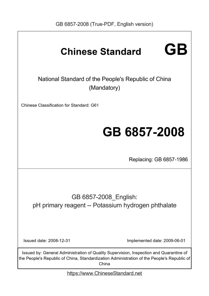 Delivery: <= 3 days. True-PDF full-copy in English will be manually translated and delivered via email. GB 6857-2008: pH primary reagent -- Potassium hydrogen phthalate Status: Valid GB 6857: Historical versions