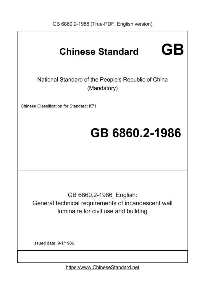 Standard ID: GB 6860.2-1986 (GB6860.2-1986)Description (Translated English): General technical requirements of incandescent wall luminaire for civil use and building