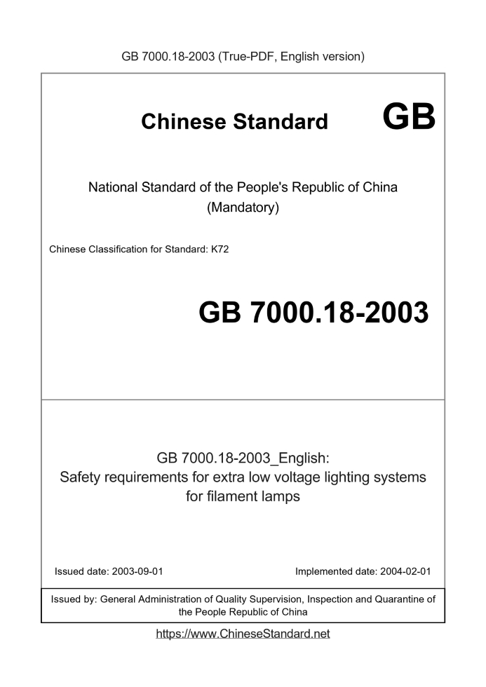Standard ID: GB 7000.18-2003 (GB7000.18-2003)Description (Translated English): Safety requirements for extra low voltage lighting systems for filament lamps