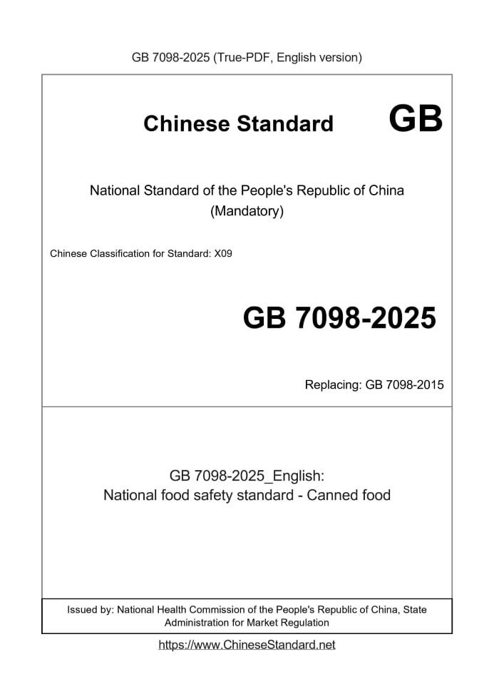 Delivery: <= 3 days. True-PDF full-copy in English will be manually translated and delivered via email. GB 7098-2025: National food safety standard - Canned food Status: Valid GB 7098: Historical versions