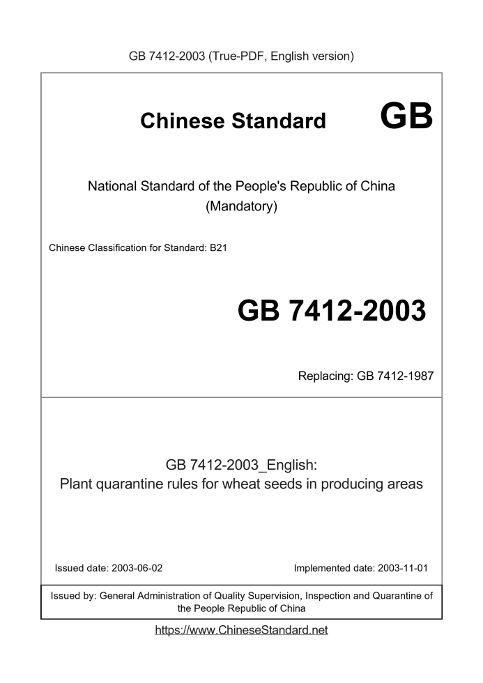 GB 7412-2003: Plant quarantine rules for wheat seeds in producing areas