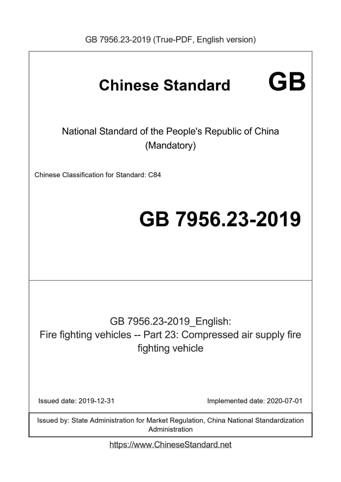 Delivery: <= 3 days. True-PDF full-copy in English will be manually translated and delivered via email. GB 7956.23-2019: Fire fighting vehicles -- Part 23: Compressed air supply fire fighting vehicle Status: Valid