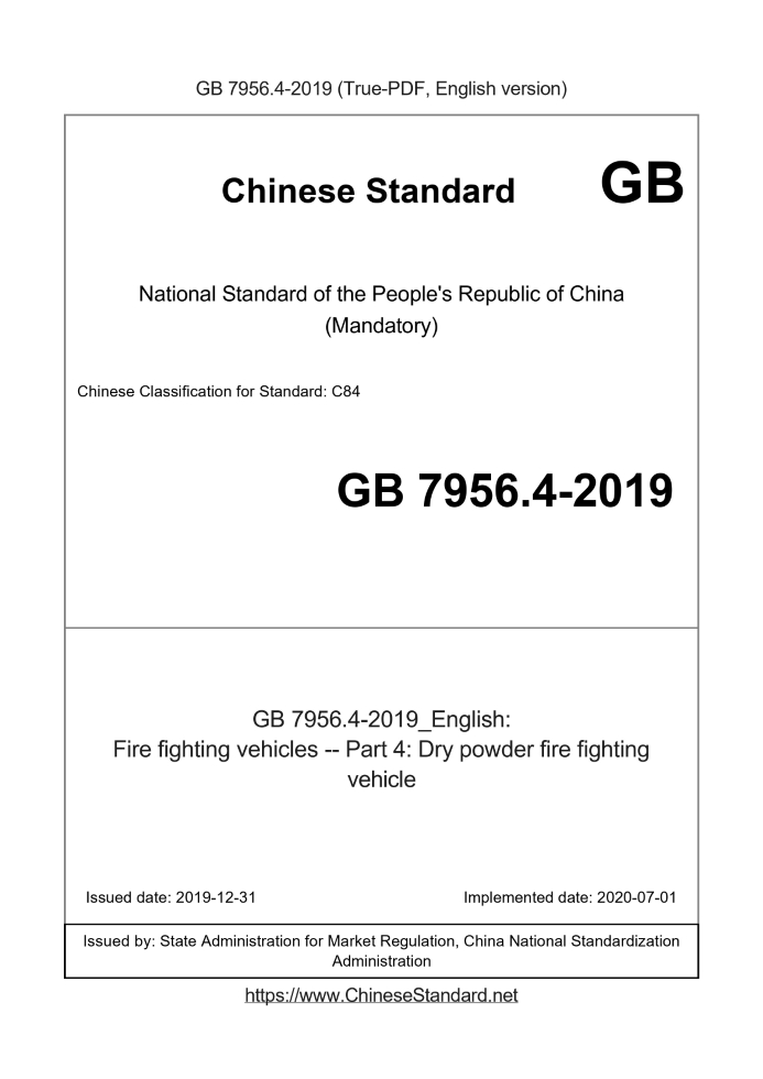 Delivery: <= 3 days. True-PDF full-copy in English will be manually translated and delivered via email. GB 7956.4-2019: Fire fighting vehicles -- Part 4: Dry powder fire fighting vehicle Status: Valid