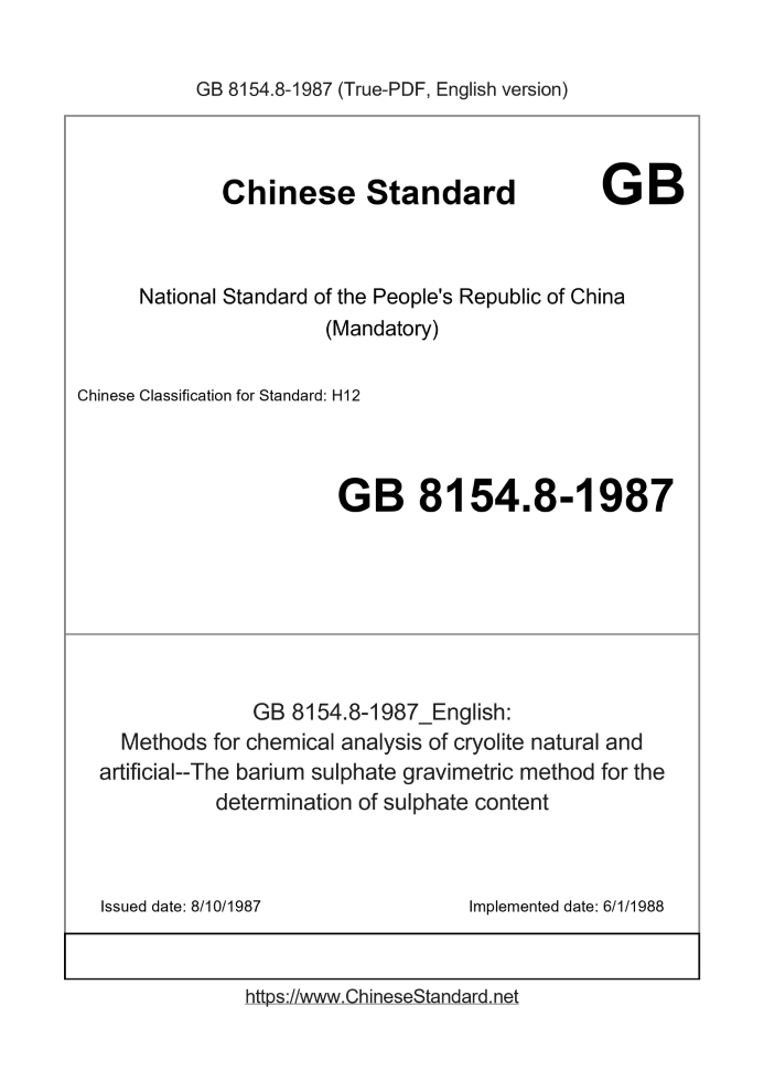US$199.00 · In stock · Download in 9 secondsGB 8154.8-1987: Methods for chemical analysis of cryolite natural and artificial--The barium sulphate gravimetric method for the determination of sulphate content