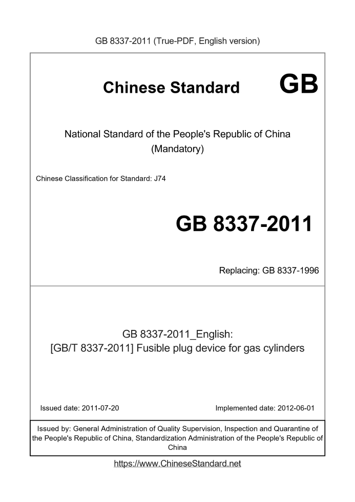 Delivery: <= 3 days. True-PDF full-copy in English will be manually translated and delivered via email. GB 8337-2011: [GB/T 8337-2011] Fusible plug device for gas cylinders Status: Valid GB 8337: Historical versions