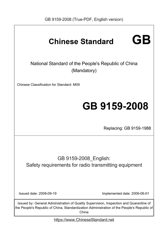 Delivery: <= 4 days. True-PDF full-copy in English will be manually translated and delivered via email. GB 9159-2008: Safety requirements for radio transmitting equipment Status: Valid GB 9159: Historical versions