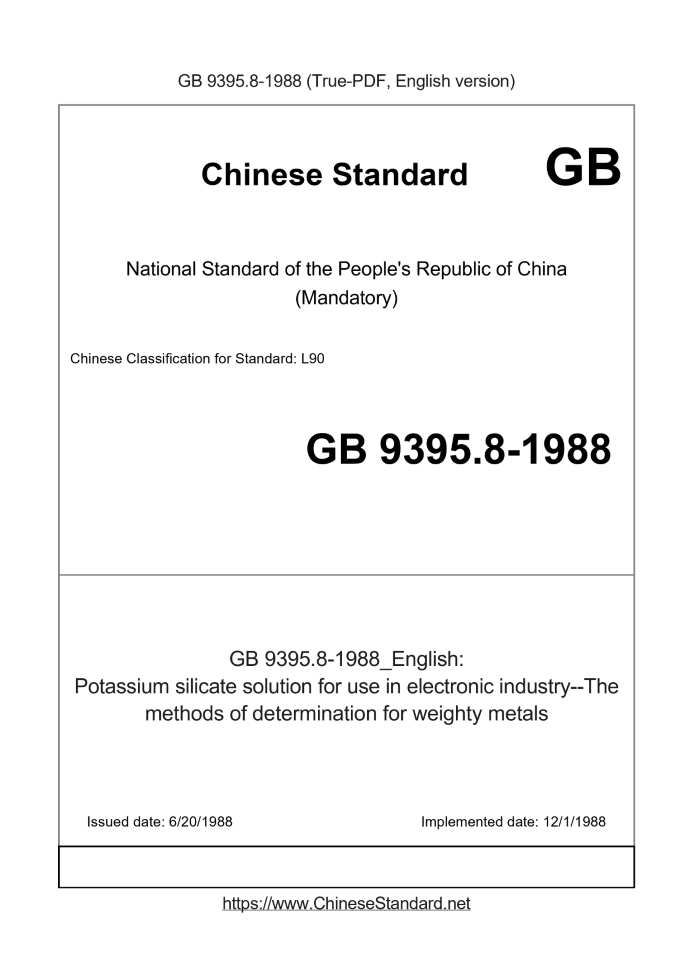 Delivery: <= 2 days. True-PDF full-copy in English will be manually translated and delivered via email. GB 9395.8-1988: Potassium silicate solution for use in electronic industry--The methods of determination for weighty metals Status: Obsolete