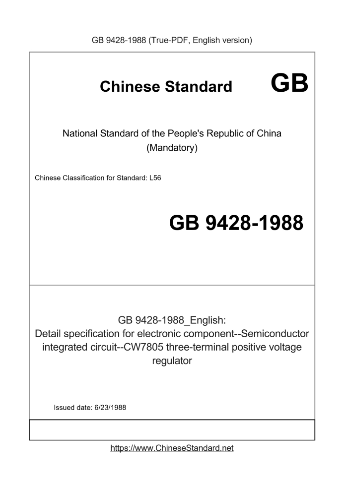 Delivery: <= 5 days. True-PDF full-copy in English will be manually translated and delivered via email. GB 9428-1988: Detail specification for electronic component--Semiconductor integrated circuit--CW7805 three-terminal positive voltage regulator Status: Obsolete