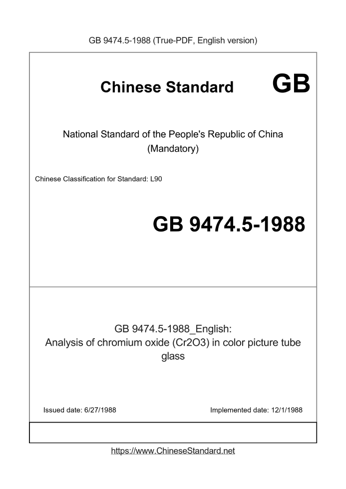 Delivery: <= 2 days. True-PDF full-copy in English will be manually translated and delivered via email. GB 9474.5-1988: Analysis of chromium oxide (Cr2O3) in color picture tube glass Status: Obsolete