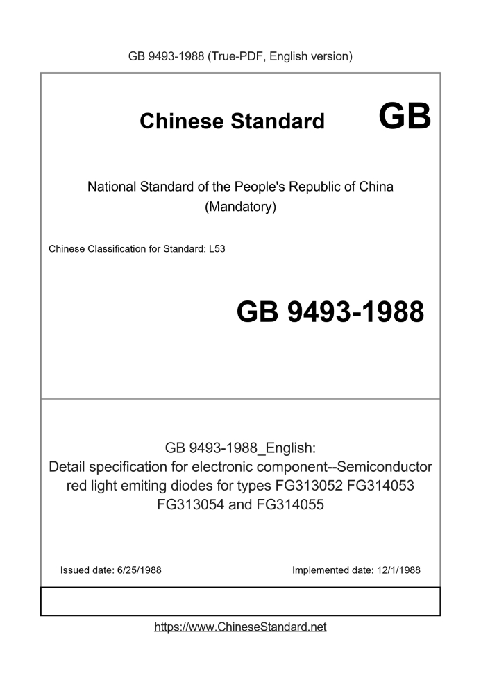 Delivery: <= 4 days. True-PDF full-copy in English will be manually translated and delivered via email. GB 9493-1988: Detail specification for electronic component--Semiconductor red light emiting diodes for types FG313052 FG314053 FG313054 and FG314055 Status: Obsolete