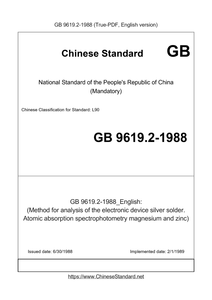 Delivery: <= 2 days. True-PDF full-copy in English will be manually translated and delivered via email. GB 9619.2-1988: (Method for analysis of the electronic device silver solder. Atomic absorption spectrophotometry magnesium and zinc) Status: Obsolete