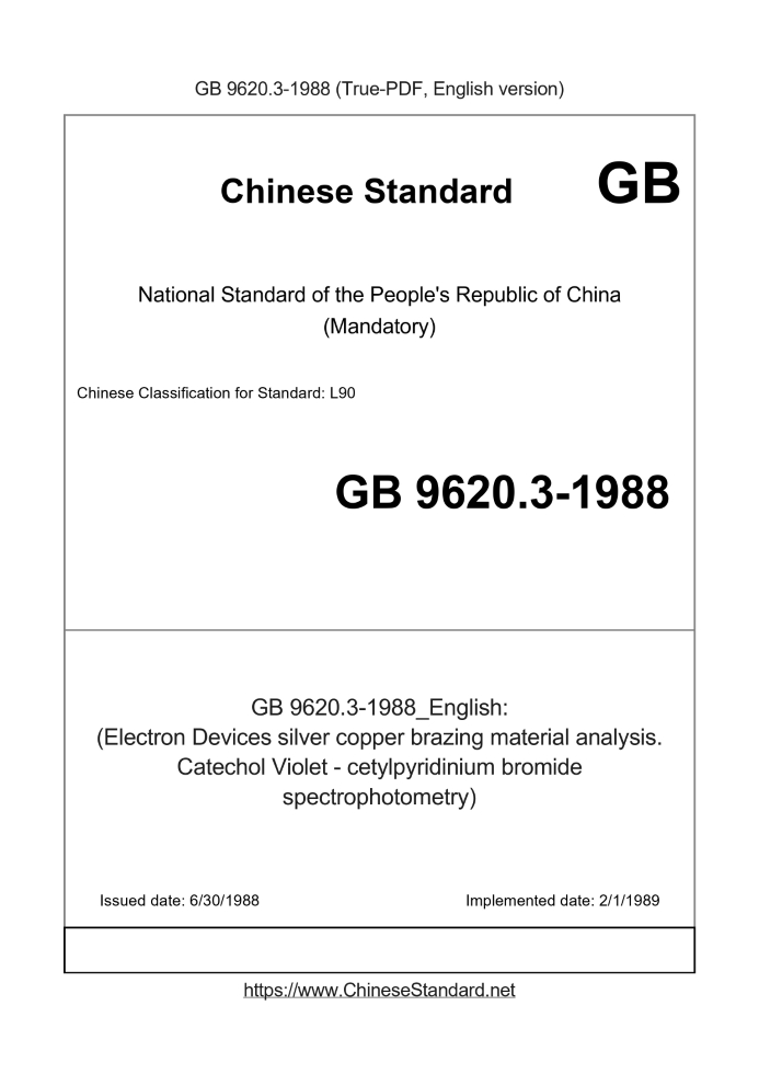 Delivery: <= 2 days. True-PDF full-copy in English will be manually translated and delivered via email. GB 9620.3-1988: (Electron Devices silver copper brazing material analysis. Catechol Violet - cetylpyridinium bromide spectrophotometry) Status: Obsolete