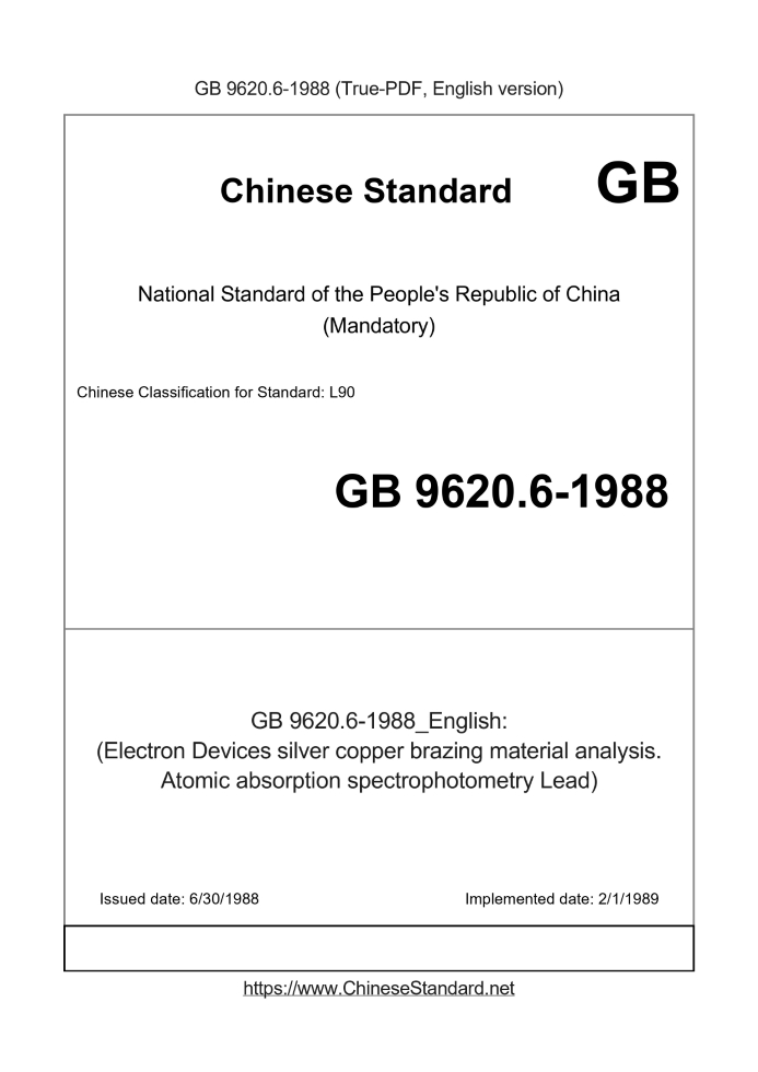 Delivery: <= 2 days. True-PDF full-copy in English will be manually translated and delivered via email. GB 9620.6-1988: (Electron Devices silver copper brazing material analysis. Atomic absorption spectrophotometry Lead) Status: Obsolete