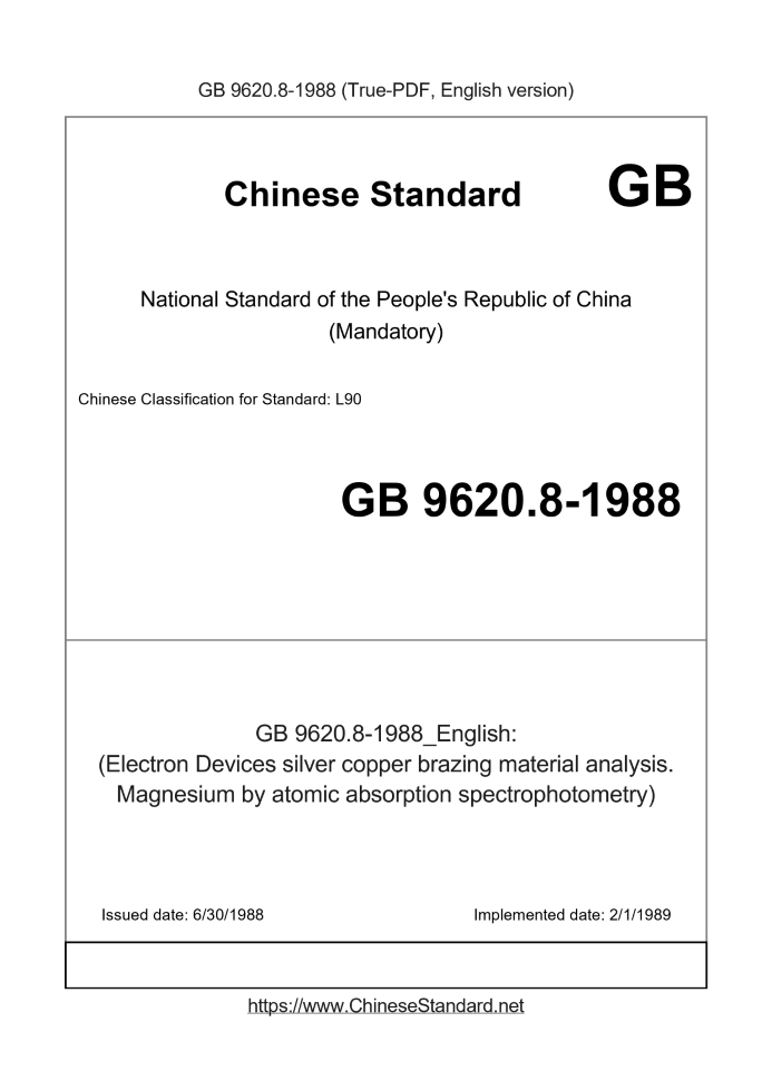 Delivery: <= 2 days. True-PDF full-copy in English will be manually translated and delivered via email. GB 9620.8-1988: (Electron Devices silver copper brazing material analysis. Magnesium by atomic absorption spectrophotometry) Status: Obsolete