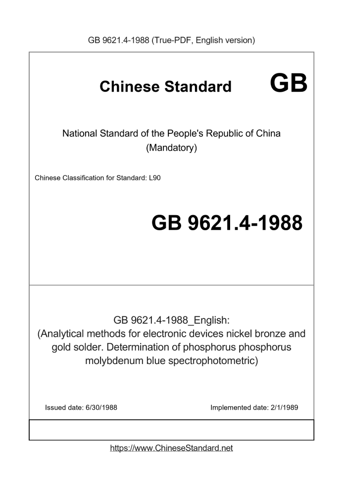 GB 9621.4-1988: (Analytical methods for electronic devices nickel bronze and gold solder. Determination of phosphorus phosphorus molybdenum blue spectrophotometric)