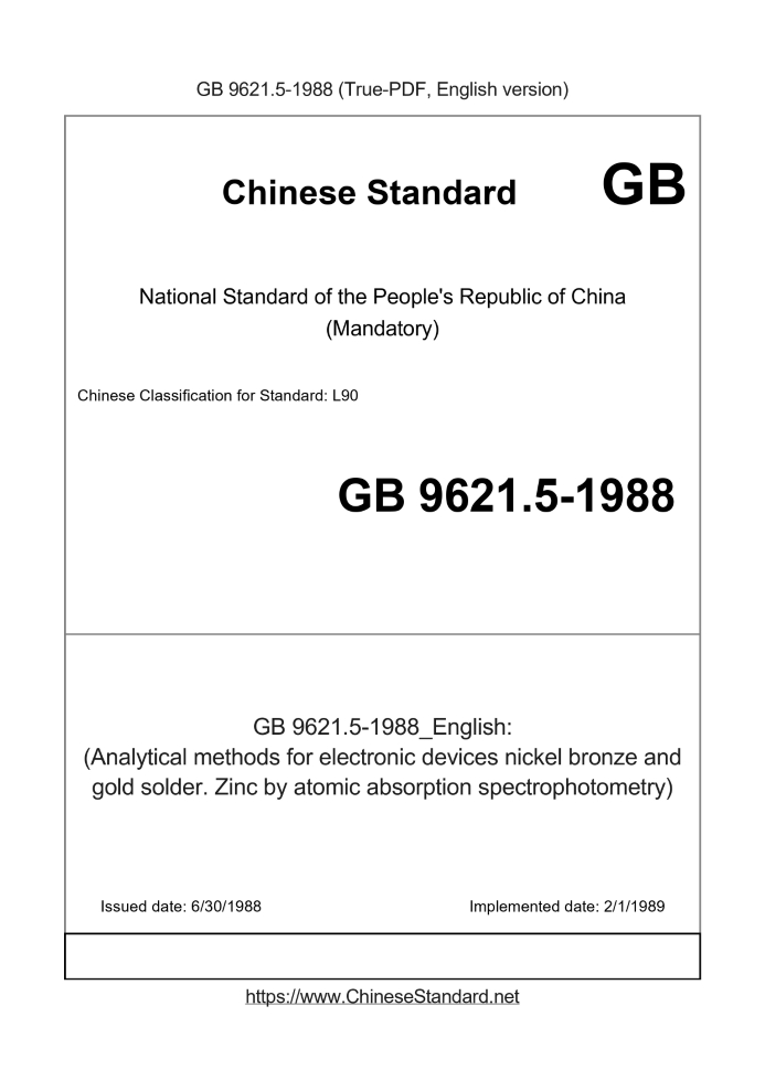 GB 9621.5-1988199 Add to Cart 2 days (Analytical methods for electronic devices nickel bronze and gold solder. Zinc by atomic absorption spectrophotometry) Obsolete
