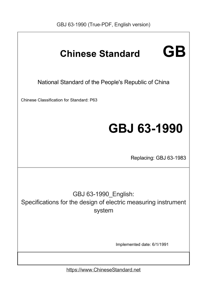 Delivery: <= 5 days. True-PDF full-copy in English will be manually translated and delivered via email. GBJ63-1990: Specifications for the design of electric measuring instrument system Status: Obsolete